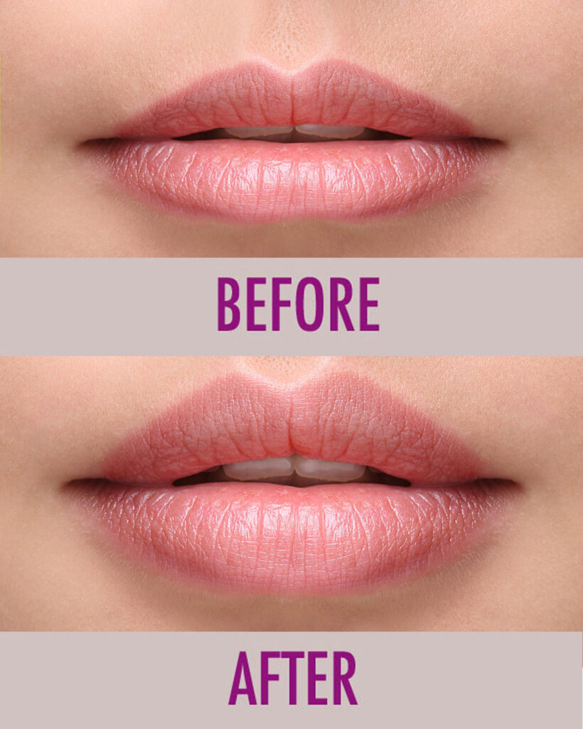 The natural appearance of your lips consists of a slightly bigger lower lip and smaller upper lip. When performing lip augmentation, it is of crucial importance to maintain the appealing ratio of your lips. Concentrating on the two soft pillows located on your lower lip will preserve the full and sensual appearance, maintaining definition all at the same time.
